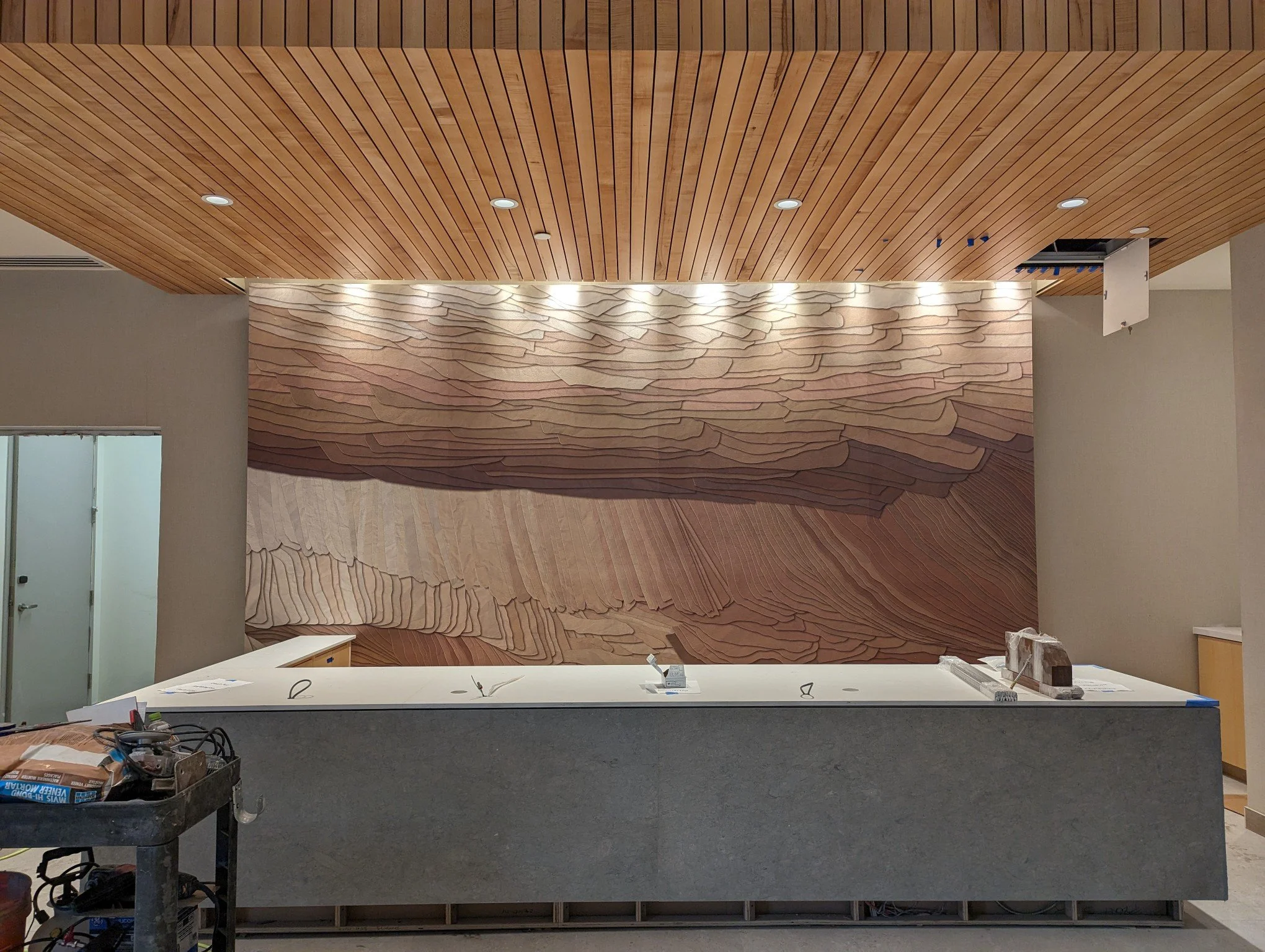 This Marriott located in downtown Salt Lake City, UT was looking for a unique piece of artwork to be displayed behind their reception desk. Taking cues from the surrounding landscape, this layered slate-inspired piece utilizes a natural color palette, rock texture, and shading techniques to give this work a dimensional and sophisticated appearance.