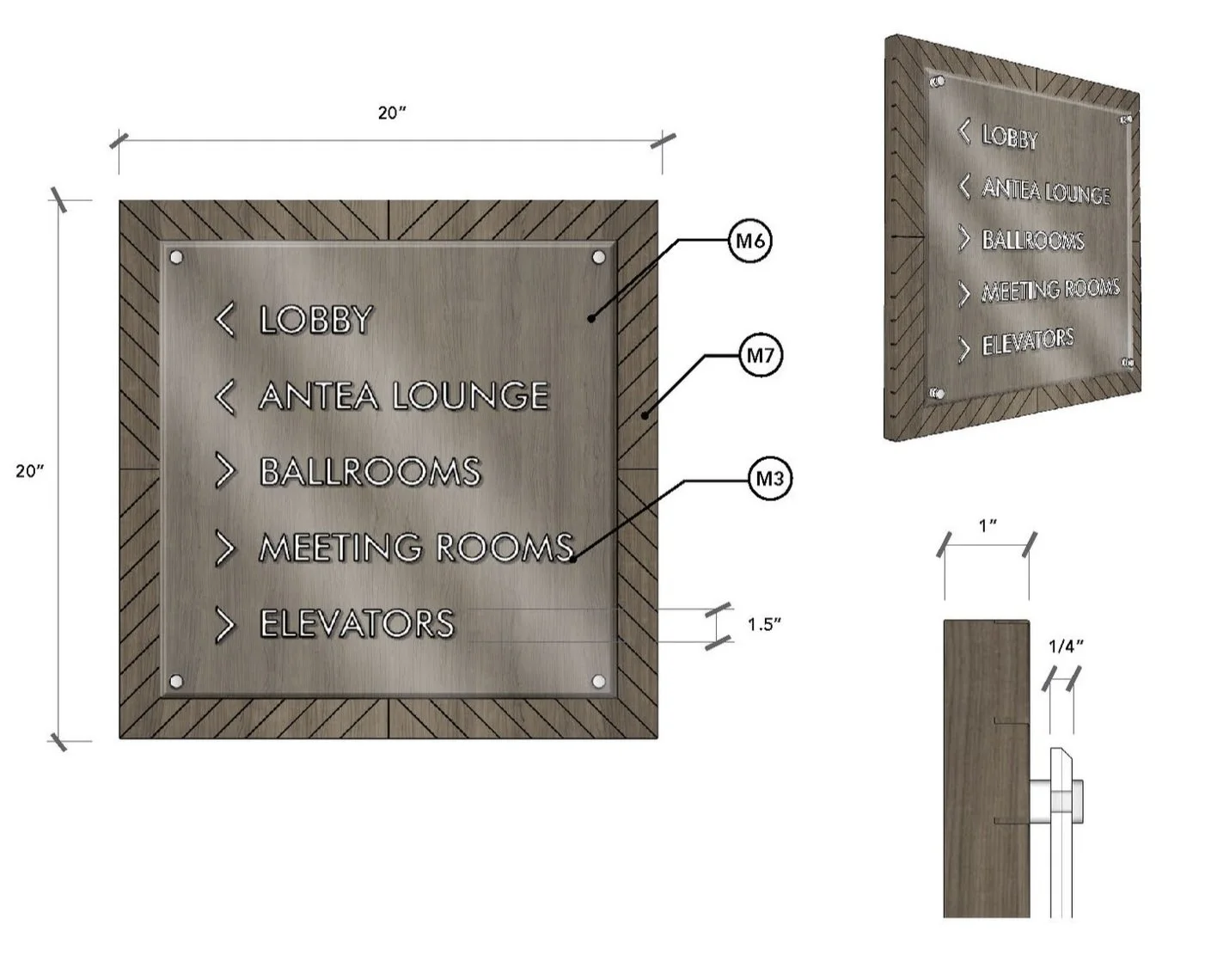 Hilton Ft. Lauderdale Marina, FL was in need of a rebranded wayfinding system for the newly renovated property. The various designs for the signage took inspiration from nautical materials, natural textures and the organic movement of waves.